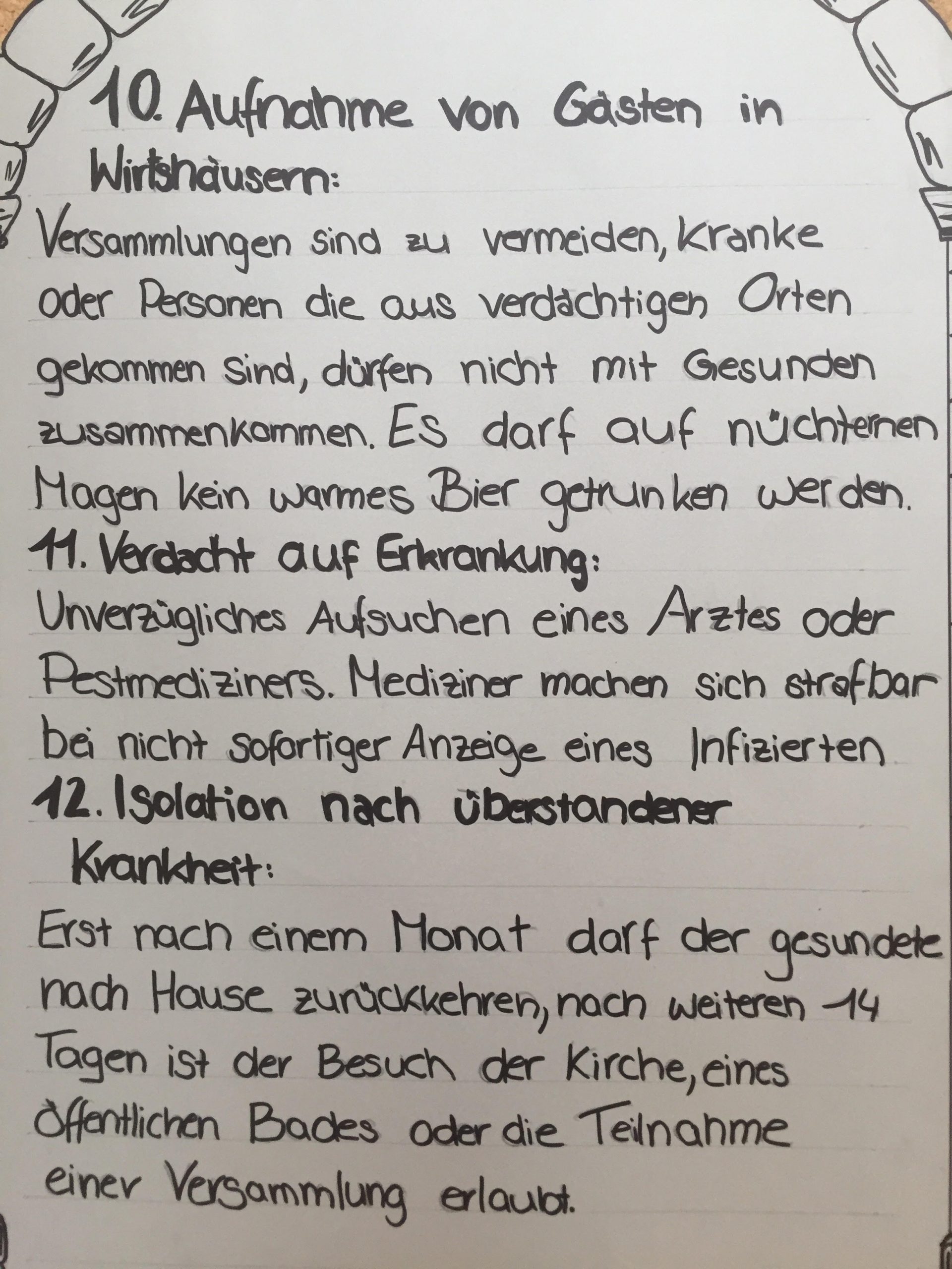 Beispielsweise Versammlungsverbote, Isolation, die Pflicht sich bei Krankheit zu melden, das Verbot Kranke zu besuchen sowie sie in seinem Haus aufzunehmen sind damals wie heute gängige Maßnahmen bei Pandemien. Auch Passierscheine, wie in Frankreich verordnet, lassen sich bis zum Schwarzen Tod zurückverfolgen. Dieser Passierschein bestätigte damals, frei von ansteckender Krankheit zu sein: „Vorzeiger: nicht allein für sich gesund/ sondern auch aus einem gesunden Hauss/ und zu Einkauffung der Marckt-Failschafften abgeschickt, Statt Regenspurg/ den …“1.
