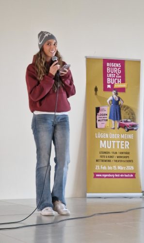 Die Geschichte handelt von der Kindheit von Ela, die zwischen ihrem autoritären Vater und der übergewichtigen Mutter steht. Die Schülerinnen und Schüler der Klasse F13G1 setzten zentrale Aspekte des Textes in Podcasts, Comics und Videos digital um. Dabei durfte auch eine etwas parodistische Version einer schnauzbärtigen Mutter nicht fehlen. Einige dieser Umsetzungen wurden gezeigt beziehungsweise vorgespielt, im Wechsel mit den Live-Darbietungen dreier Mitglieder der Poetry-Slam-Gruppe der Schule.Sie sind auch hier auf der Seite unter der Rubrik „Regensburg liest“ zu finden.