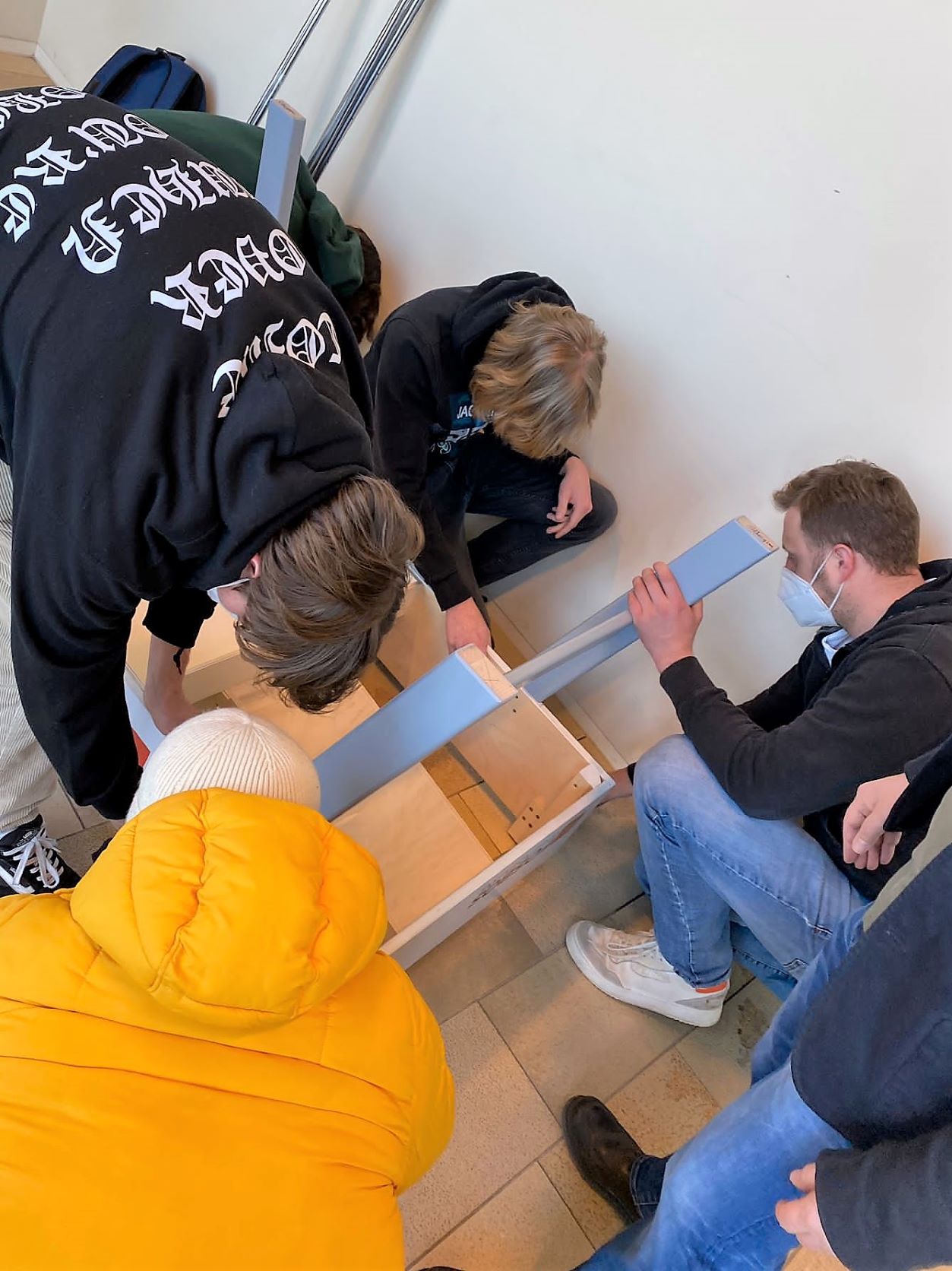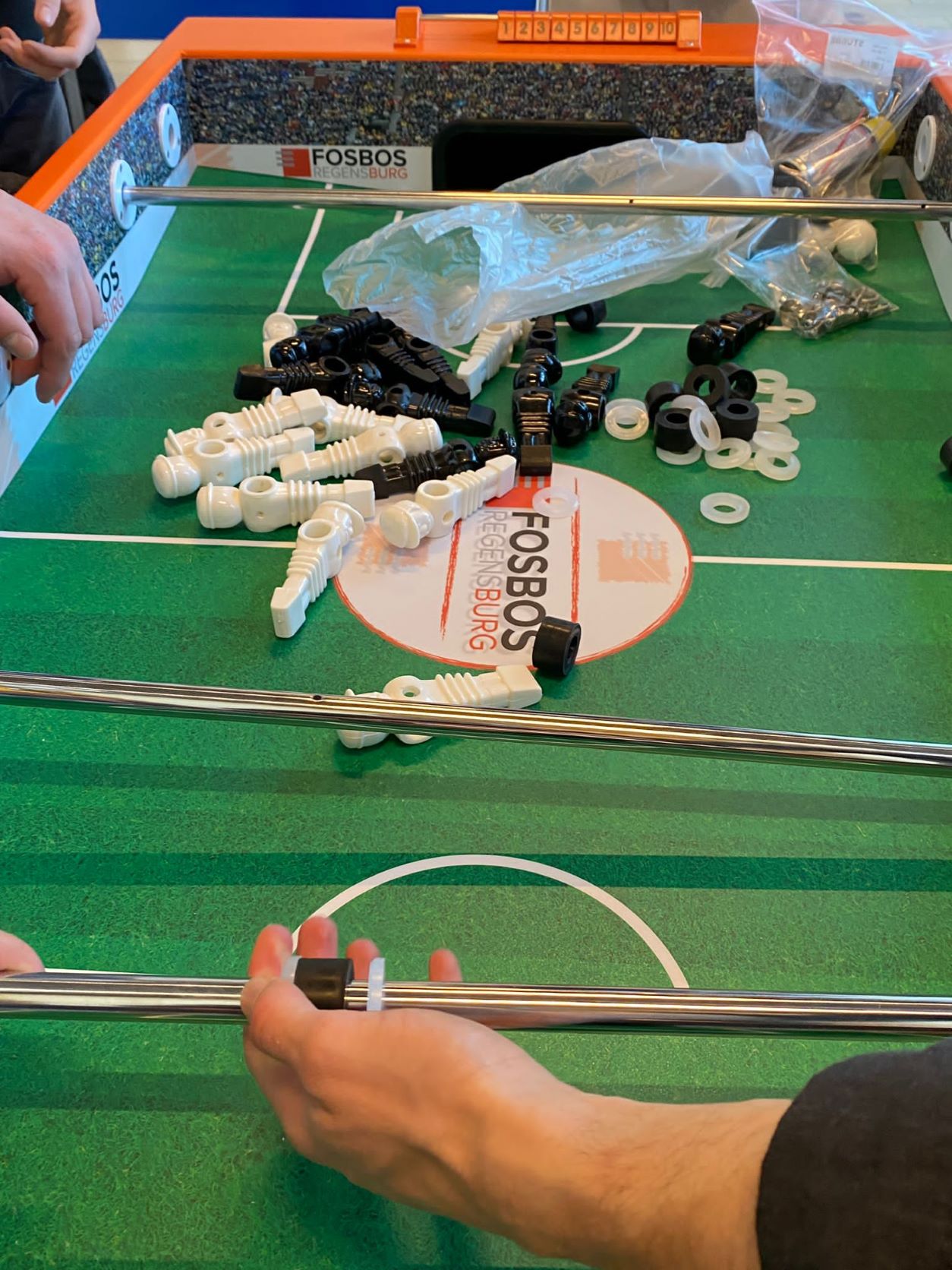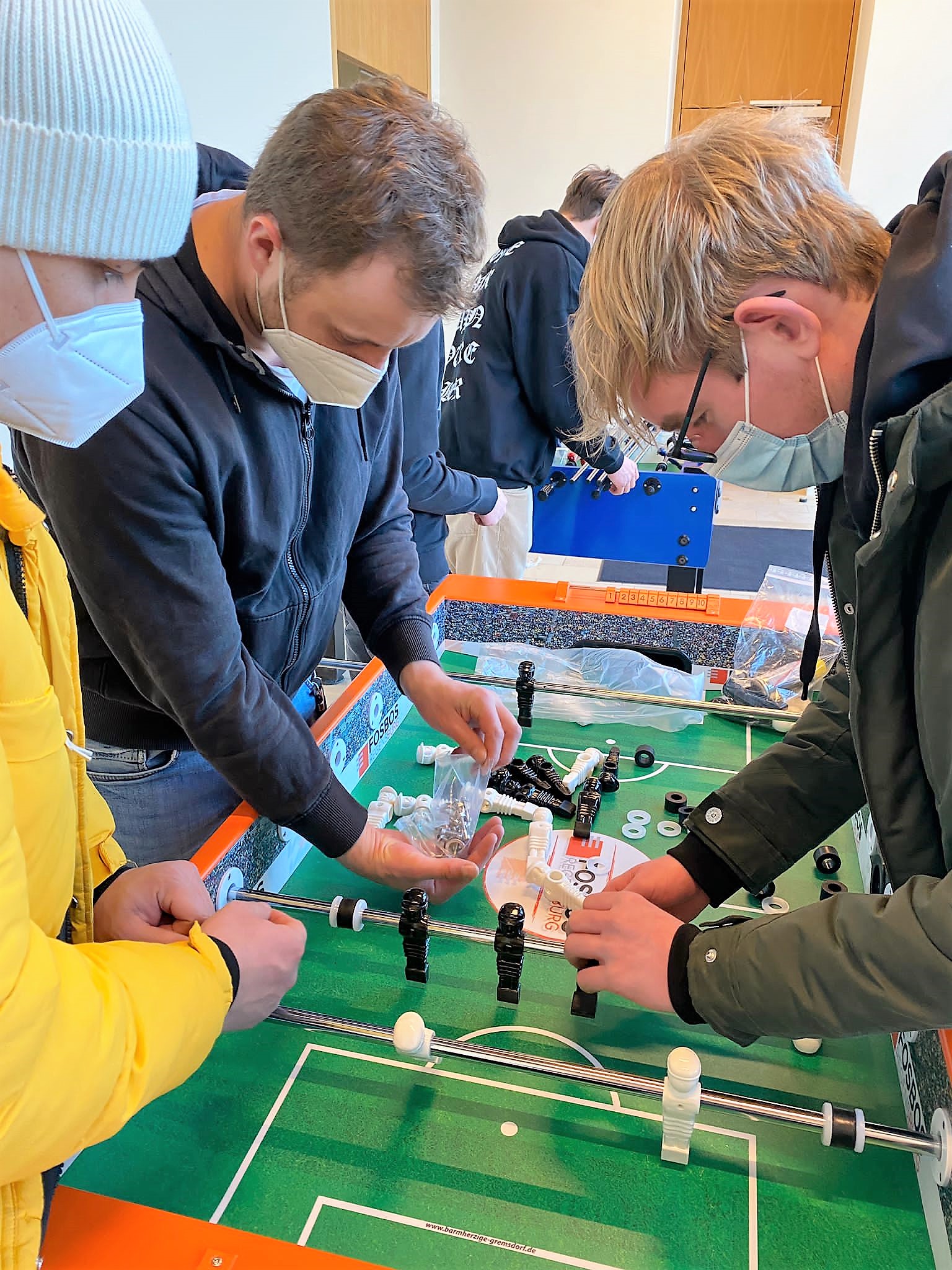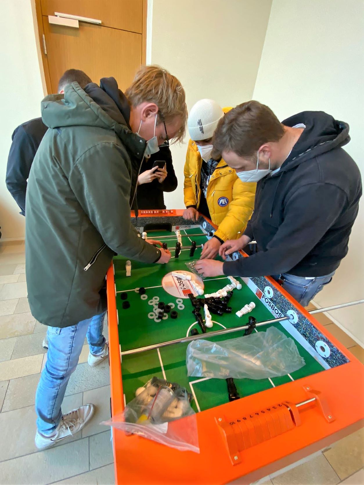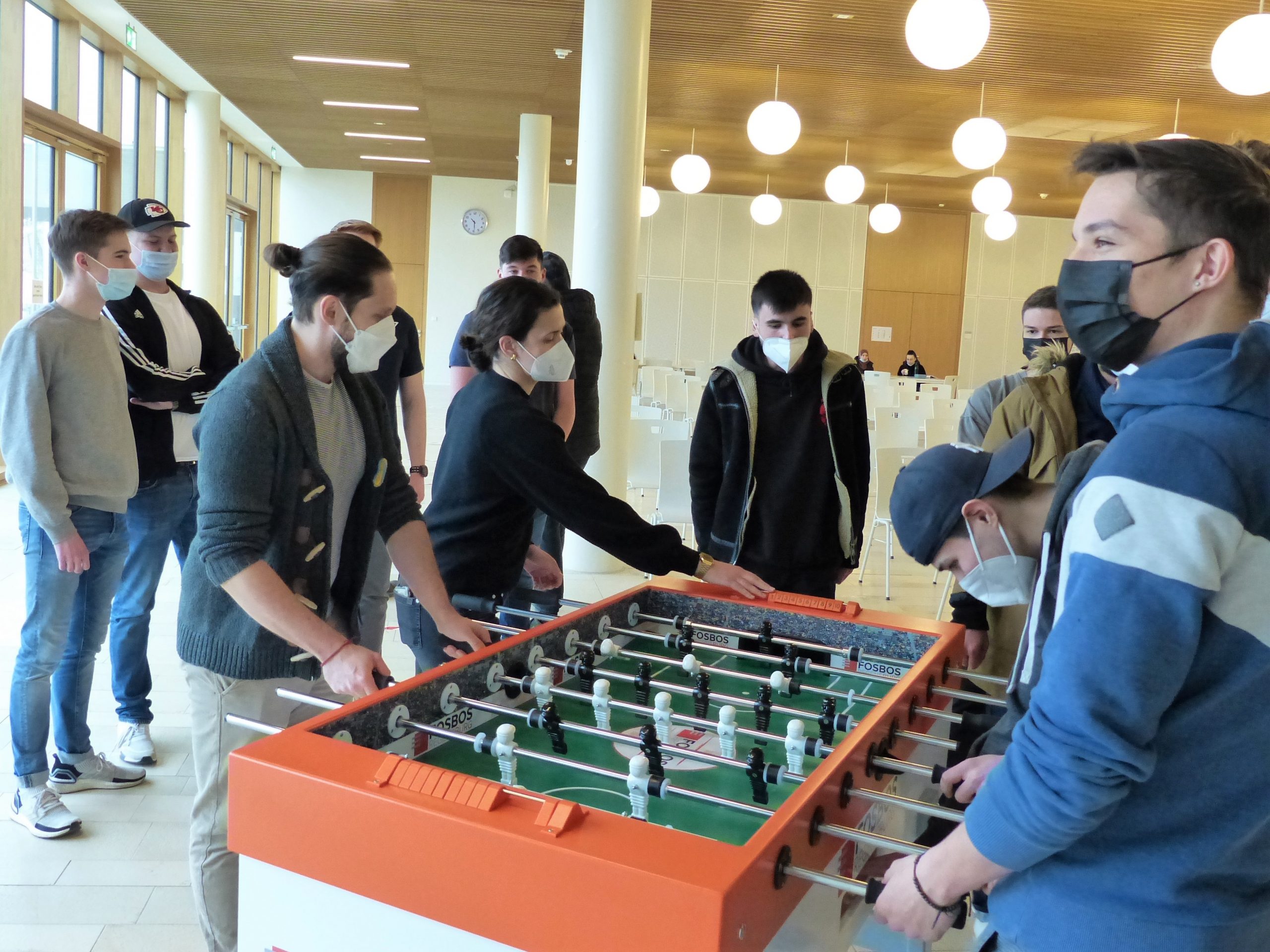 Der Kicker wurde hier von Schülern aufgebaut und geölt. Besonders mitgeholfen haben Yassin Mohseni, Aisenur Kaplan, Elias Murr und Thomas Baierl. In Anwesenheit von Schulleiter Dr. Völkl wurde das Sportgerät am Weltfrauentag von einer gemischten Mannschaft gebührend eingeweiht.